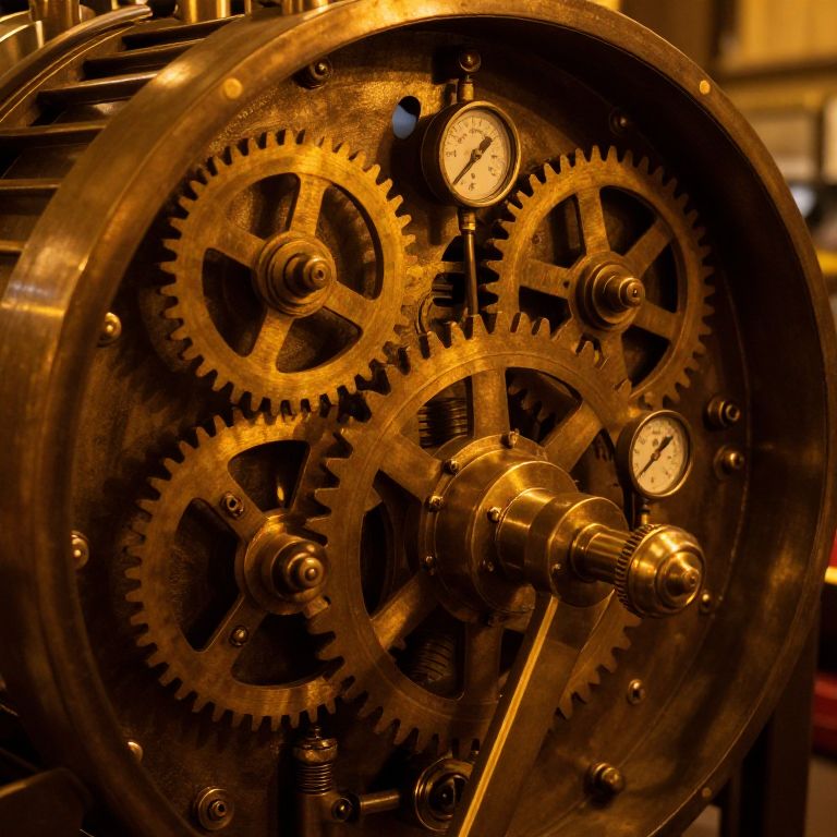 A detailed assembly of steam punk gears and cogs inside a large clockwork engine, brass levers and polished metal parts, with small gauges and pressure dials, bathed in warm golden light with subtle shadows