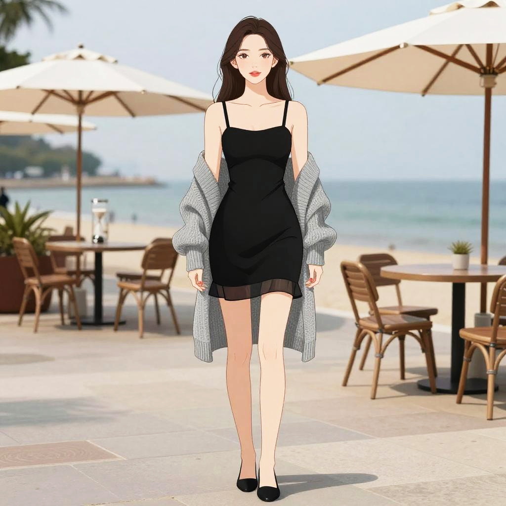 A Hourglass woman, drawn in a contemporary style, wearing a black sleeveless mini dress with a sheer hem and a gray oversized knit cardigan, stands at a seafront promenade with outdoor cafes, simple black flats completing her look. Sexy. Pretty face and beutiful eyes