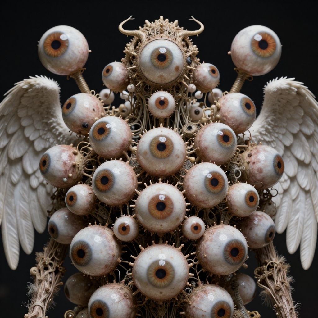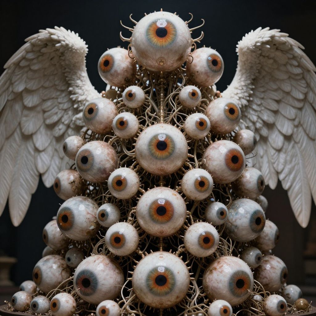 Detailed View Of The Model, a hideous mass of eyeballs and angel wings, weird, confusing, chaotic, fantasy, cinematic lighting, award winning photography,