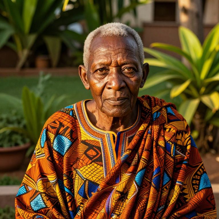 Imagine a portrait photograph of an esteemed African elder with profound, knowing eyes and smooth skin kissed by the sun's warmth. He sits amidst a tranquil garden, his vibrant traditional attire adorned with intricate patterns. The soft golden light filters through lush foliage, casting subtle shadows that enhance his serene expression and the scene's overall atmosphere. Captured from an elevated 'eye-level' perspective, this portrait exudes reverence for the wise figure's tranquility and deep insight into life's mysteries, inviting viewers to reflect on the timeless wisdom embodied by this distinguished elder.