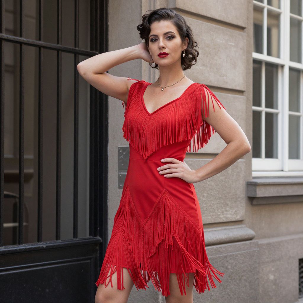 Red Fringe Flapper Dress, a woman in a red dress posing for a picture