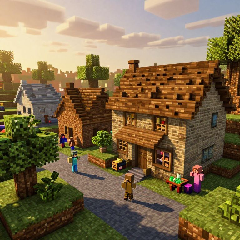 Pixel art village scene at sunset: stone cottage with brown roof, colorful characters, green trees, garden, and bright sky. Minecraft style.