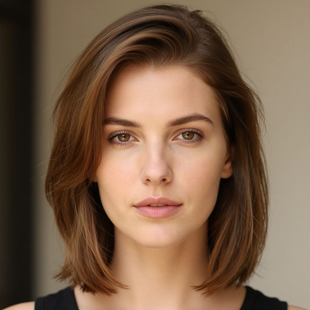 Caucasian woman with side part with soft layers hairstyle, polished and structured, enhances facial symmetry, perfect for square or wide face shapes, clean lines, soft shadows, neutral background, realistic skin and hair details, warm daylight setting