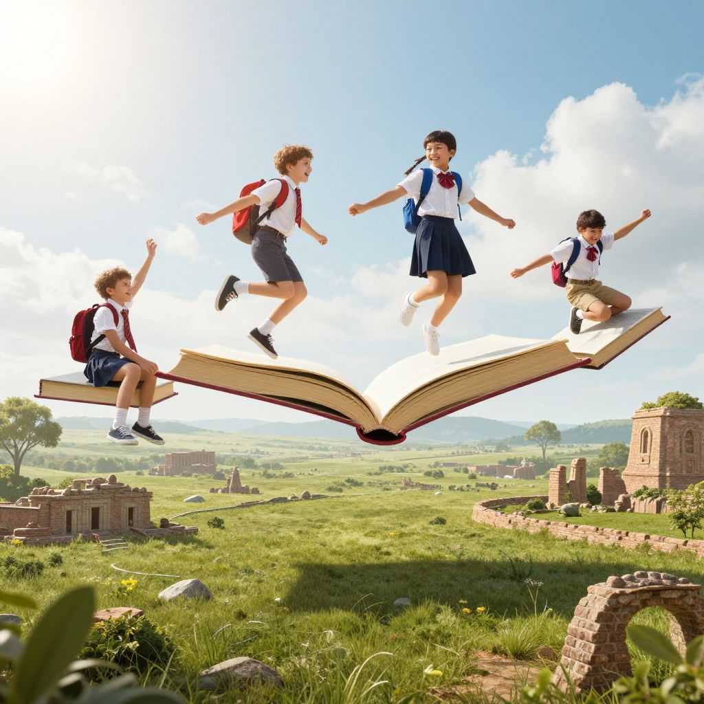 Journeying through the boundless realms of imagination, schoolchildren soar atop giant textbooks, their laughter echoing over shifting landscapes and ancient ruins, embodying the freedom of discovery and the endless possibilities of learning.