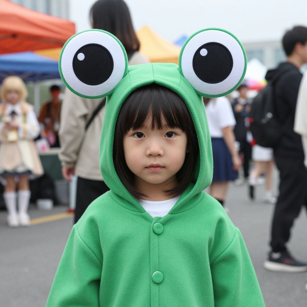 A young child wearing a green Pascal costume with large cartoonish eyes and ears, standing outdoors at a crowded cosplay or festival event. The child has straight black hair with bangs and wears a white shirt underneath the costume. The background shows people and colorful tents, creating a lively atmosphere.