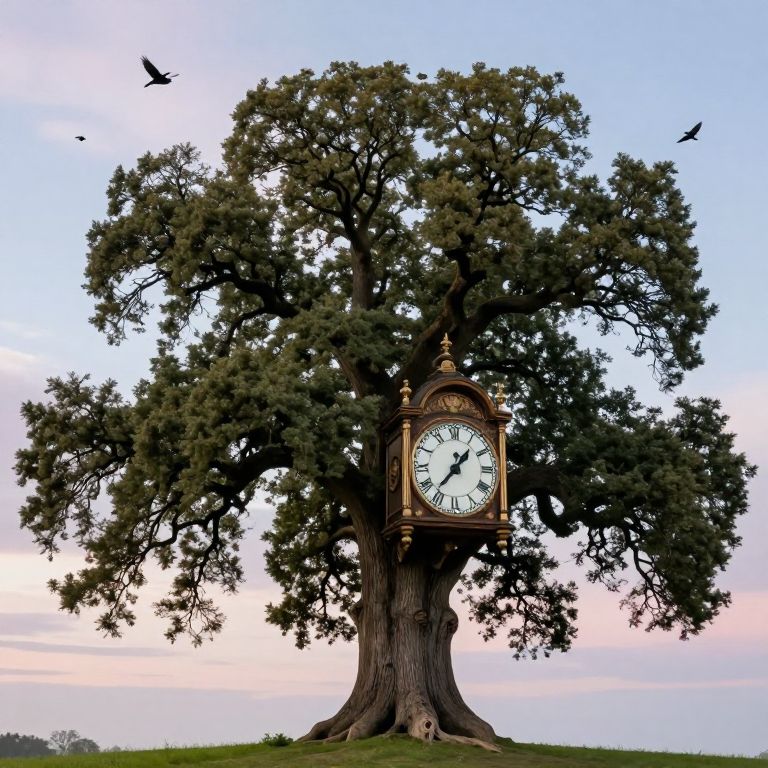 A colossal oak tree seamlessly integrates a massive, vintage-style clock into its gnarled trunk, defying the boundaries between nature and machinery as birds soar gracefully against a serene, dreamlike sky.