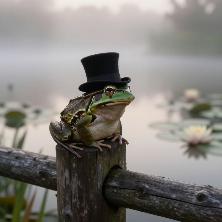 Close-up of frog in top hat with glossy eyes reflecting a sunlit garden, soft bokeh background, highly detailed, studio lighting mimicking natural daylight, focus on textures and fine details of frog and hat