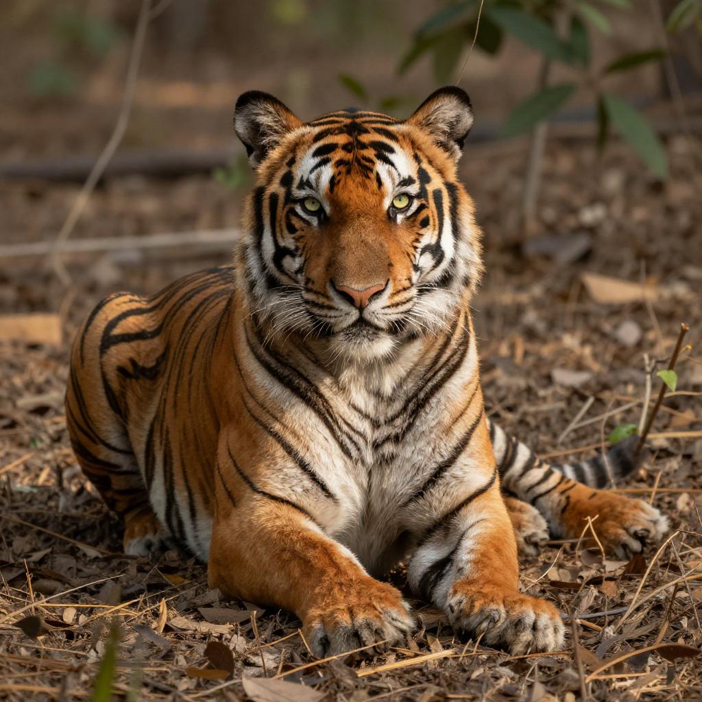 Photograph of a majestic Bengal tiger lying in a dense, dry forest. The tiger's striking orange and black stripes stand out against the brown and green foliage. Its intense, yellow-green eyes are focused on the camera, and its front paws are stretched out in front. The tiger's powerful build and thick fur are clearly visible, with sunlight filtering through the trees, casting dappled shadows.