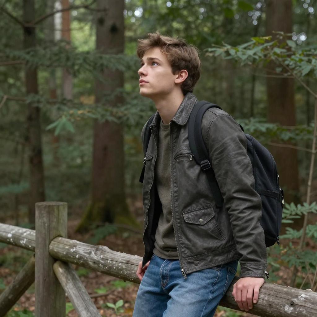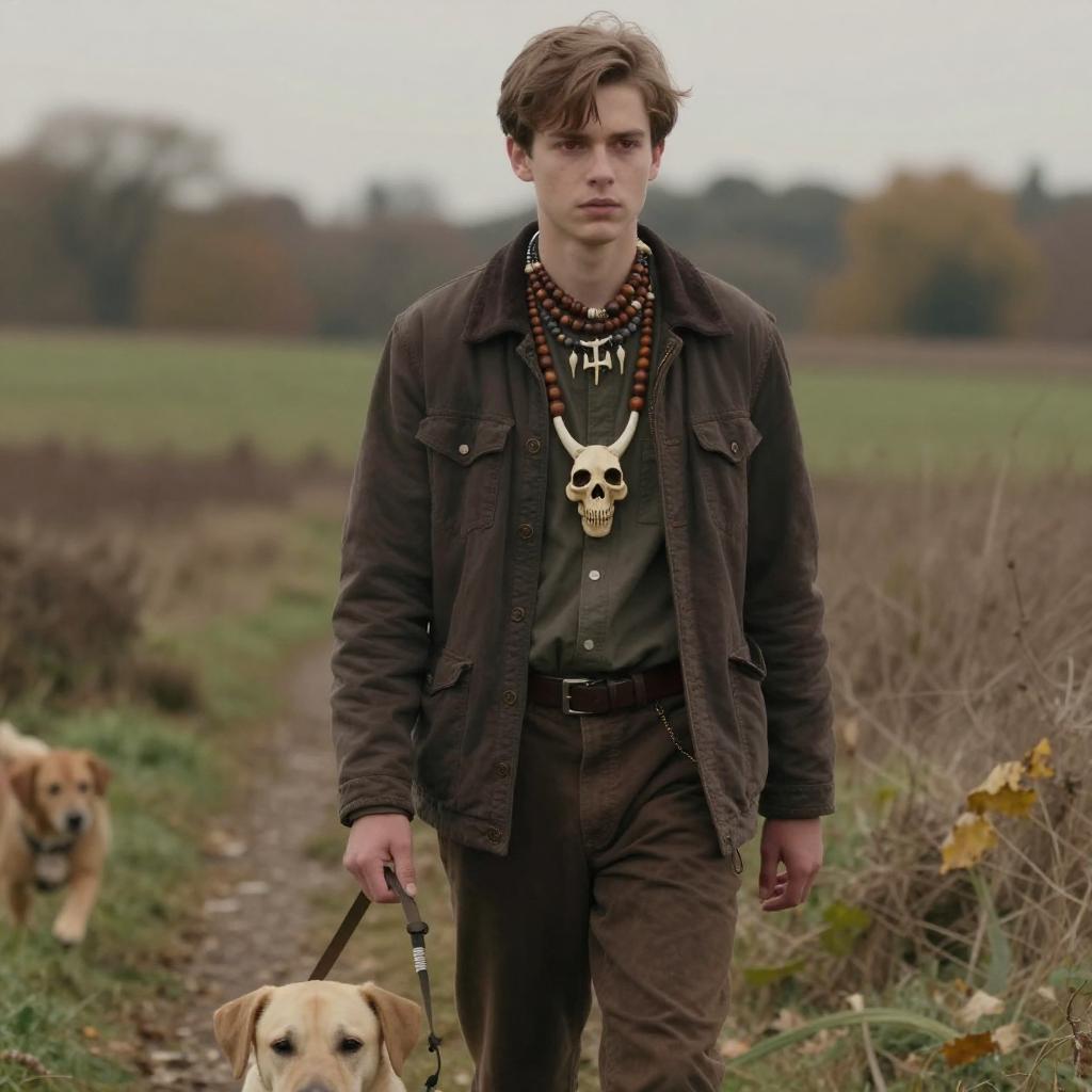 A man walking his dog in the countryside, inkpunklite768, f/1.4, square image, close up film photo, portrait of a Teenage Boy, brown straight, red eyes, wood and bone jewelry, elegant pose, atmospheric lighting, cinematic composition, detailed, autumn, filmgenre__
