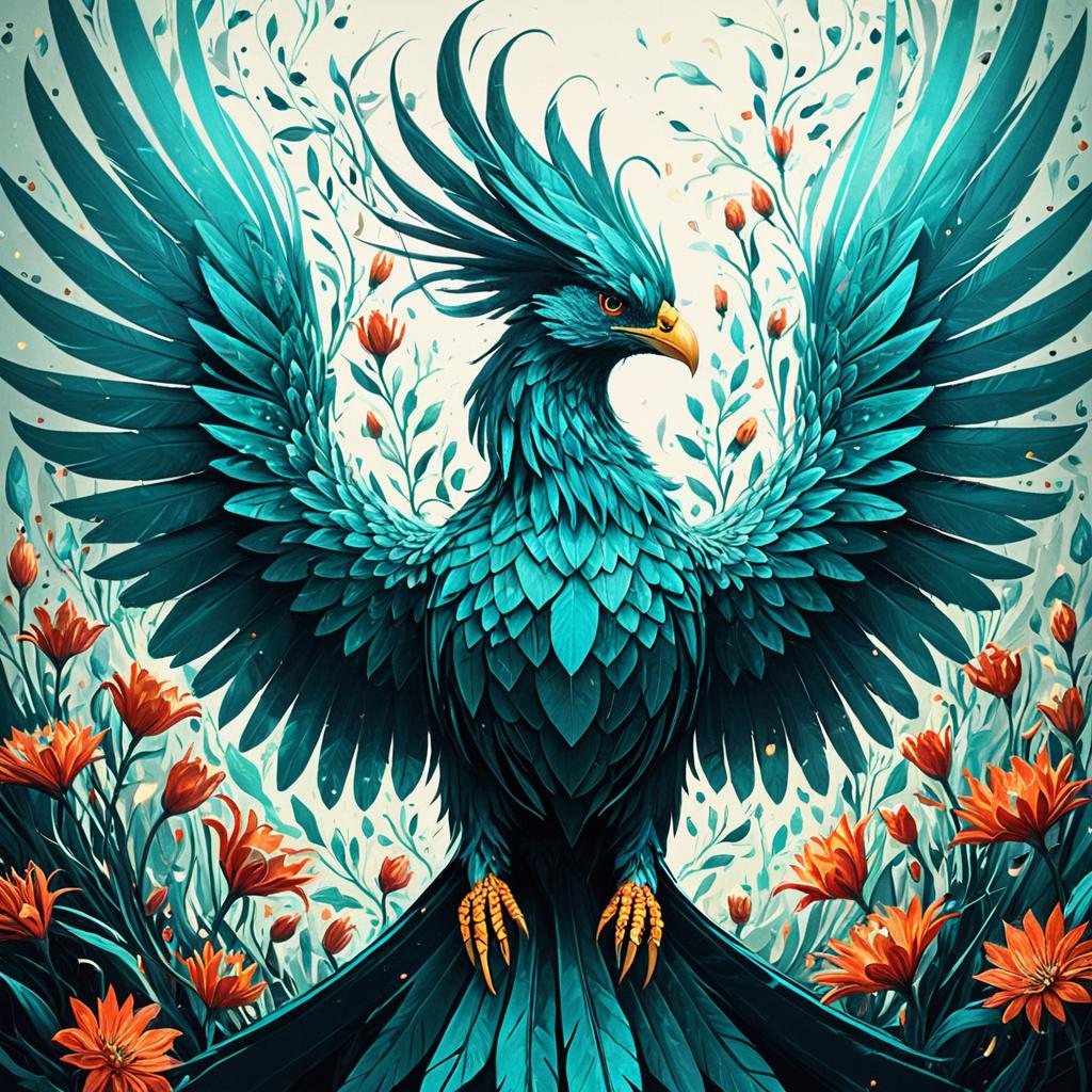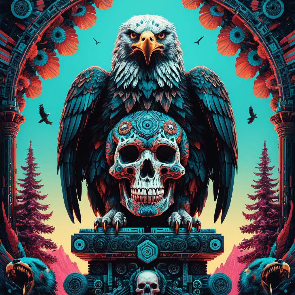 Intricately detailed digital painting of a symmetrical totem featuring a fierce eagle perched above a decorated skull. The artwork includes roaring bears, stylized trees, and an ornate arch with vibrant reds, blues, and teal hues, creating a psychedelic and hyper-realistic effect. This high-resolution, 4k octane render artwork draws inspiration from psychedelic and tribal totem designs.