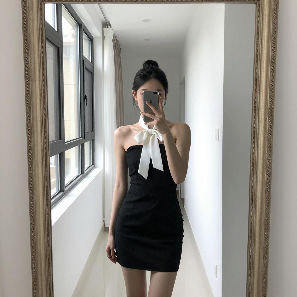 Woman with long dark hair takes a mirror selfie. She wears a black and white plaid strapless top and a white pleated skirt. She holds a pink phone with a black heart sticker in her right hand, resting her left hand on a white countertop. The background has a marble wall, a small shelf with a plant, and a door. Her facial expression is neutral.