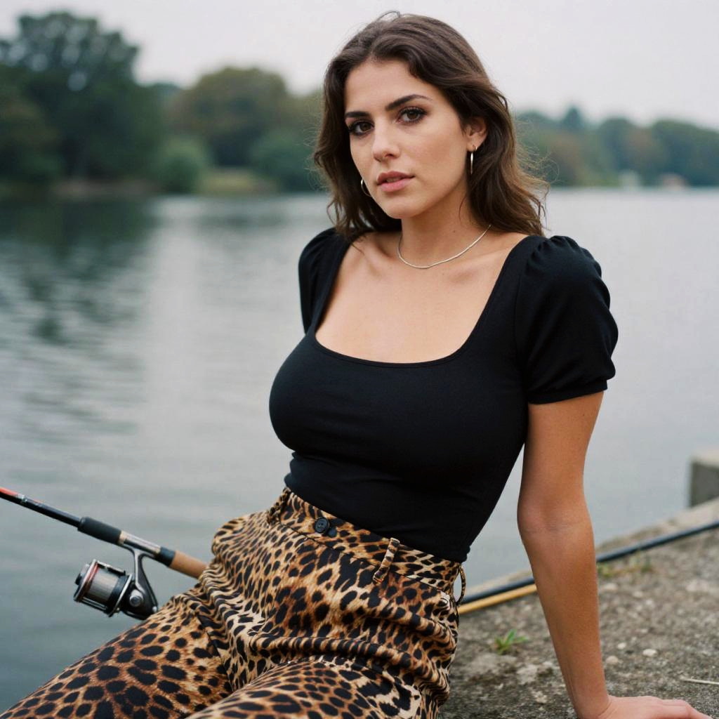 A tall woman in a casual contemporary leopard print two-piece outfit featuring a cropped tank and high-waisted midi skirt, paired with black chunky sneakers and minimalist jewelry, stands on a fishing pier with fishermen in the background. The scene is captured in a Collodion wet plate style. Sexy. Pretty face and beаutiful eyes. Big breasts