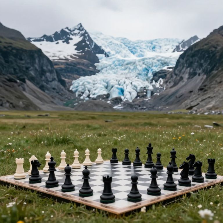 An epic chessboard stretches across a serene valley, where life-sized pawns tread solemnly through a whispering meadow, their movements mirrored by the silent, majestic glacier crowned by a king of black ice—a metaphorical dance of strategy and solitude, evoking the timeless struggle between ambition and the enduring embrace of nature.