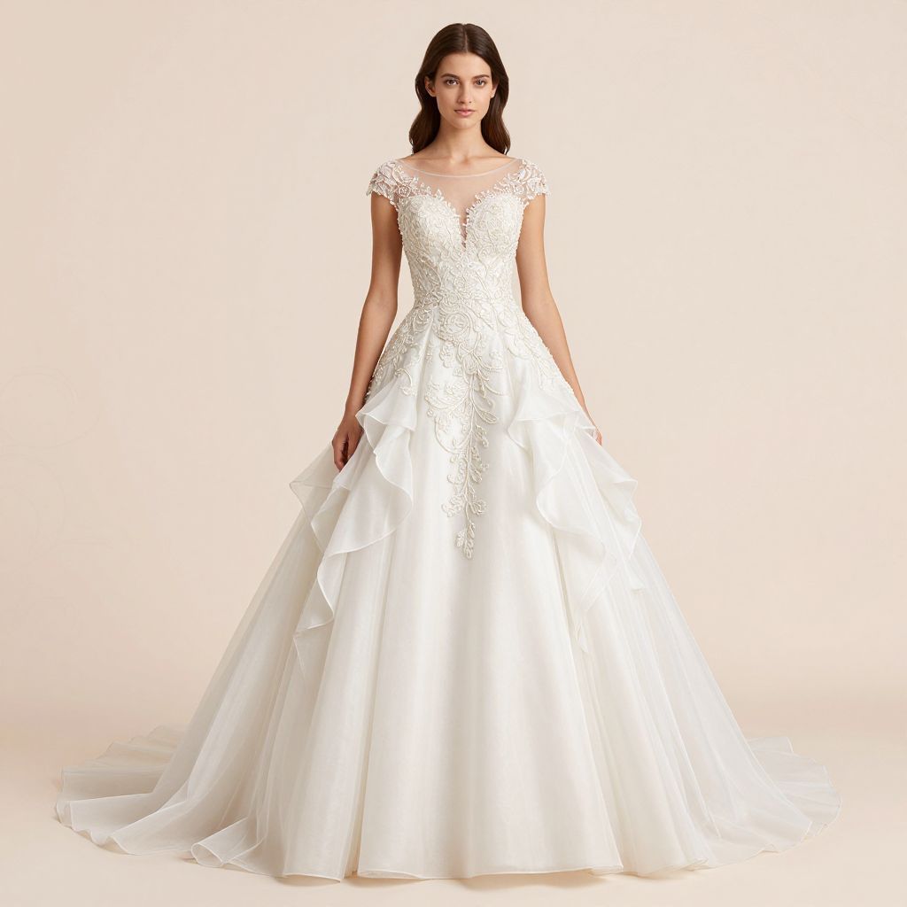 A high-definition digital rendering showcases a woman elegantly dressed in a bridal gown featuring intricate embroidery and beading on a ruffled organza skirt, set against a soft, pastel background with subtle floral patterns.
