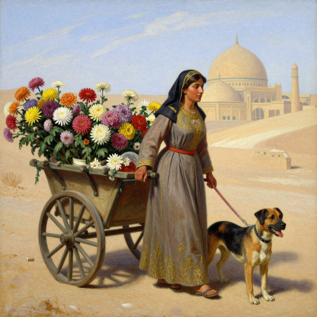 Photograph of a Middle Eastern woman with dark skin and brown eyes, wearing a black headscarf, brown long-sleeve blouse, and beige embroidered skirt, holding a leash of a black and white dog. She stands beside a wooden cart with large spoked wheels, filled with vibrant chrysanthemums in yellow, pink, white, and red. The background features two beige domed buildings under a clear blue sky, suggesting a desert or oasis setting. The woman's expression is calm, and her attire is traditional and modest, highlighting cultural attire. The dog appears alert and healthy.