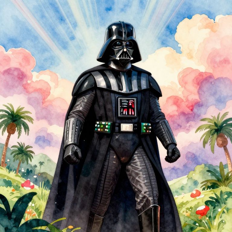 Target stunning Darth Vader fighting, lush vegetation, soft fluffly epic clouds, max rive, vibrant, watercolor colorful, dramatic cinematic lighting, volumetric rays, 4k, 8k,