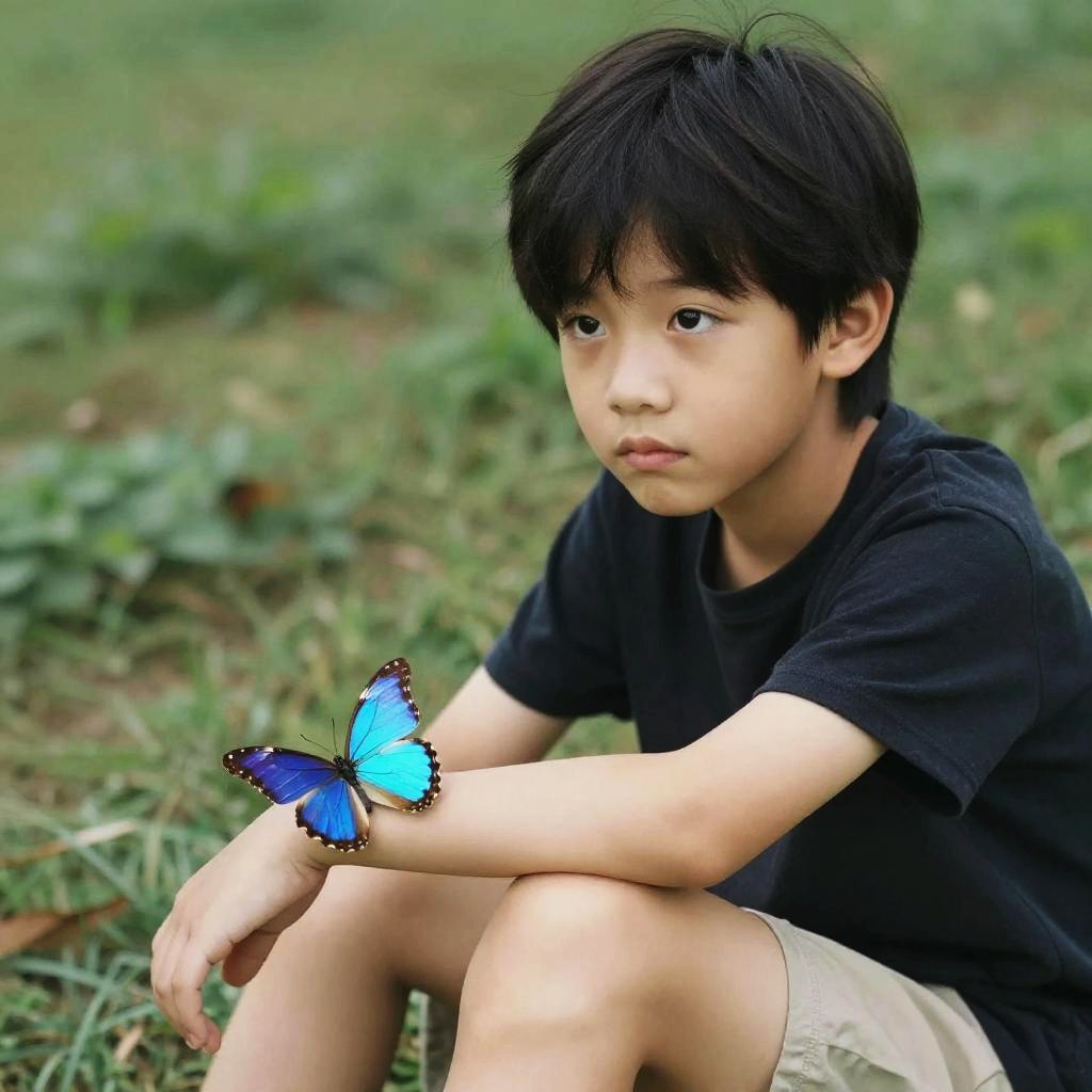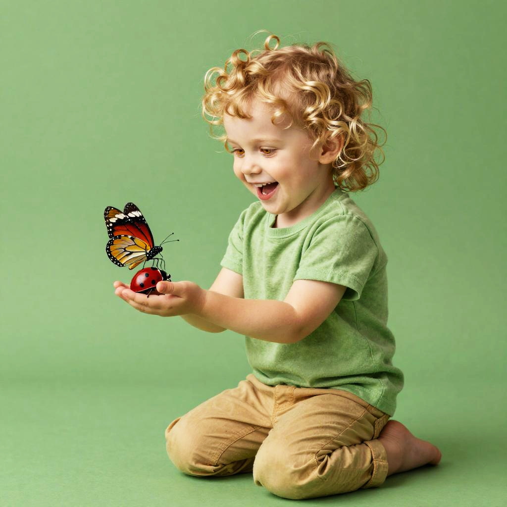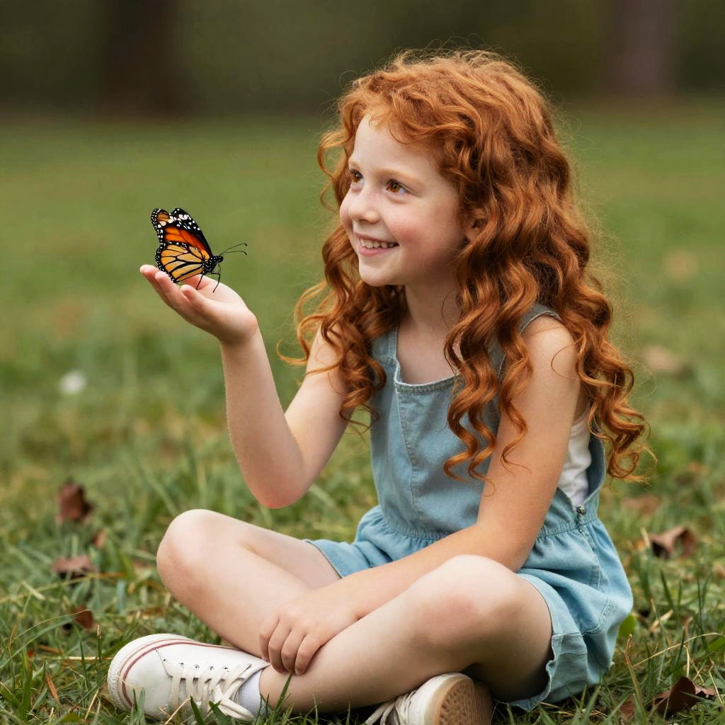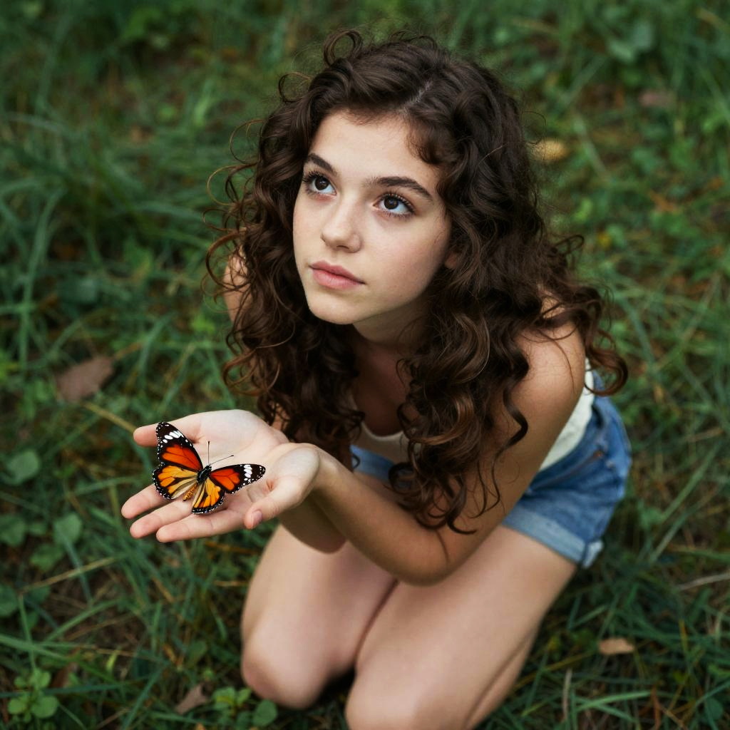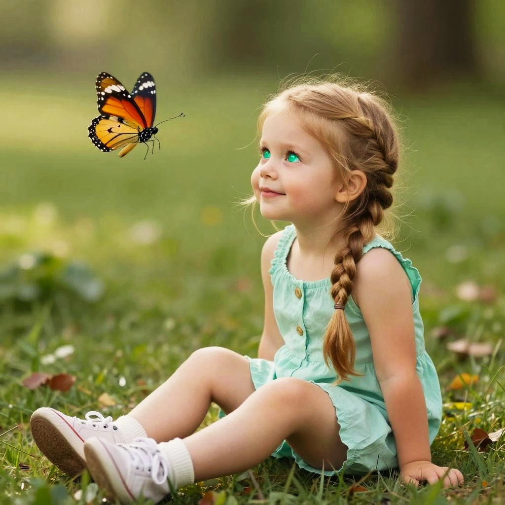 Full body, solo, dreamy teenage girl with long blond waves and sparkling gray eyes, sitting, realistic style, butterfly, butterfly fluttering by right ear, gazing upwards with wonder, vibrant colors, rich detail, green background