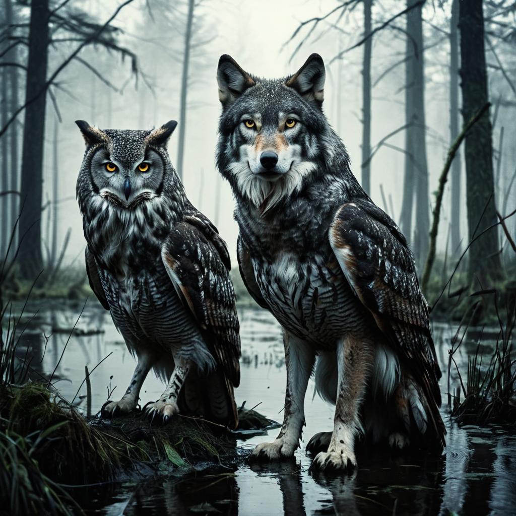 A dark fantasy portrait of two humanoid animals with bodies combining features of a wolf and an owl, standing in a misty swamp. The wolf-owl hybrids have detailed fur and feathers with intense eyes, exhibiting mysterious and captivating glances. The forest background with sparse, tall trees and swamp water creates an eerie and mystical atmosphere.