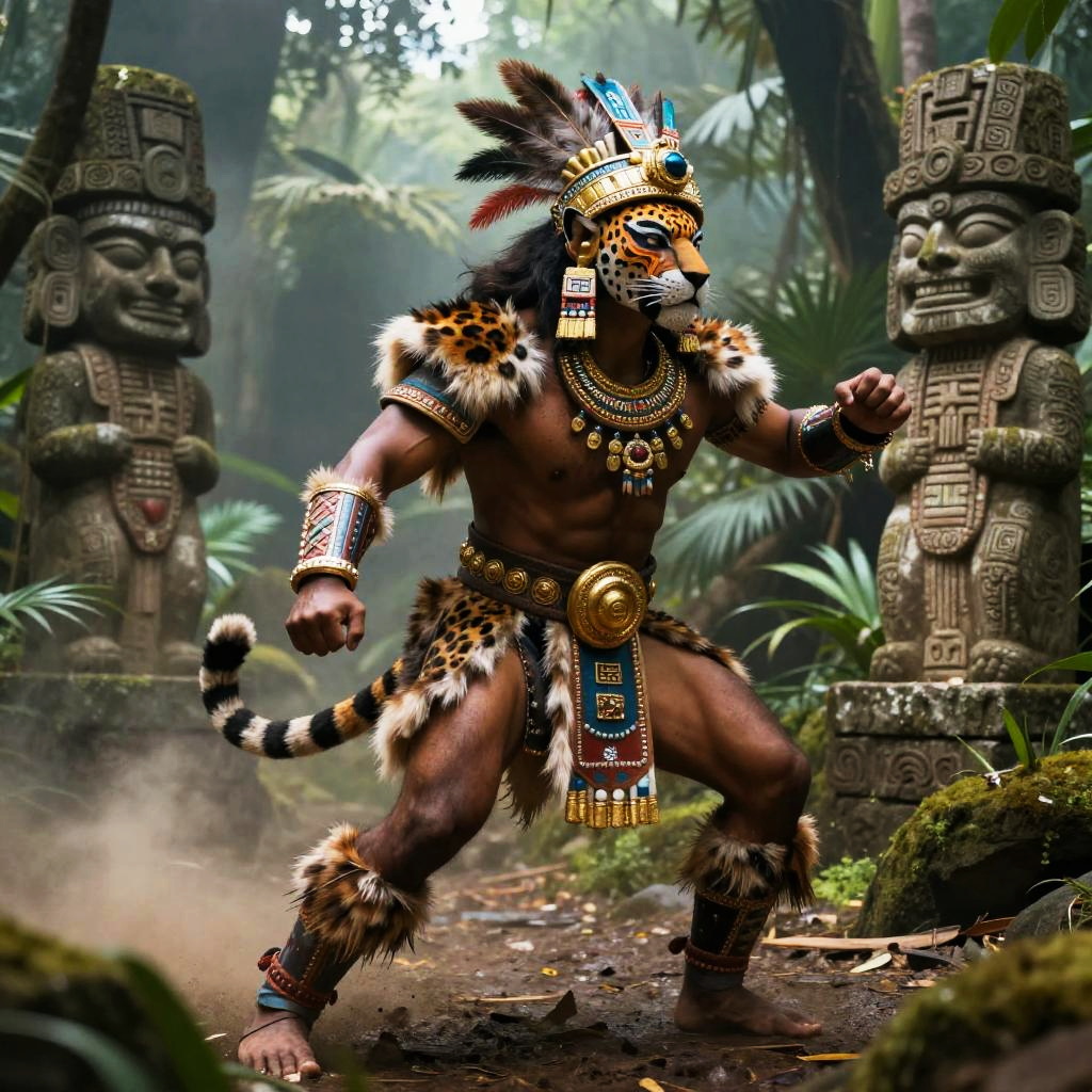 Fantasy Aztec warrior mid-battle, muscles tense, adorned in ceremonial jaguar pelts and gold jewelry, with fiery war paint, charging through a lush jungle clearing filled with mysterious fog and ancient carved stone statues, dynamic action scene, richly textured.