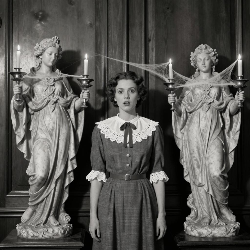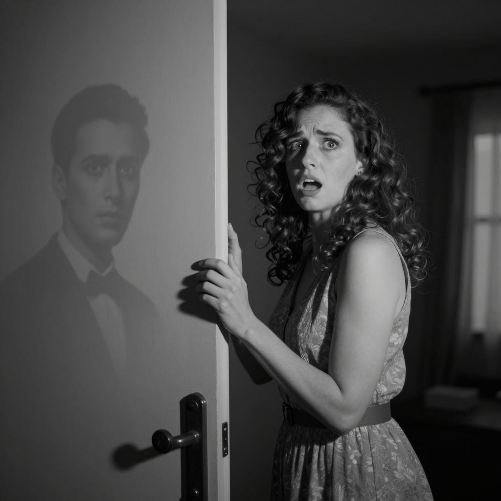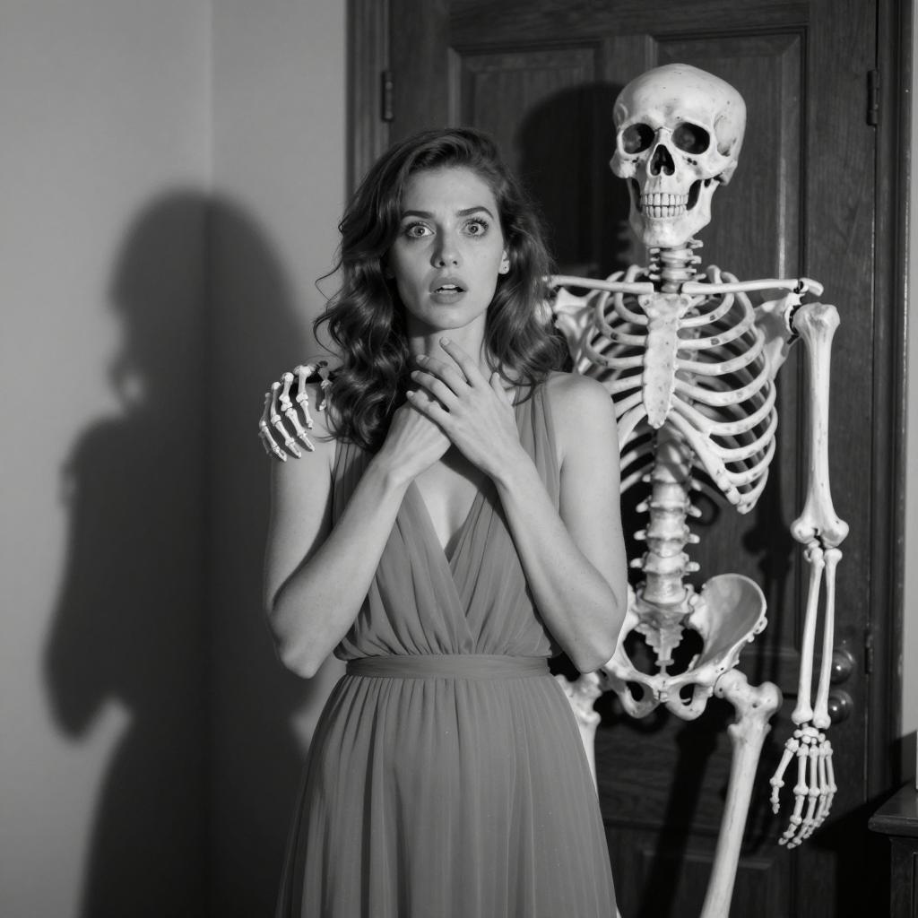 Black and white photograph of a woman in a flowing, sleeveless dress standing next to a human skeleton. The woman has wavy, shoulder-length hair, a startled expression, and her hands are clasped in front of her chest. The skeleton is positioned to her right, with its skeletal arms resting on her shoulders. The background includes a dark wooden door. The skeleton's shadow is cast on the wall behind it. The woman's shadow is also visible on the left.