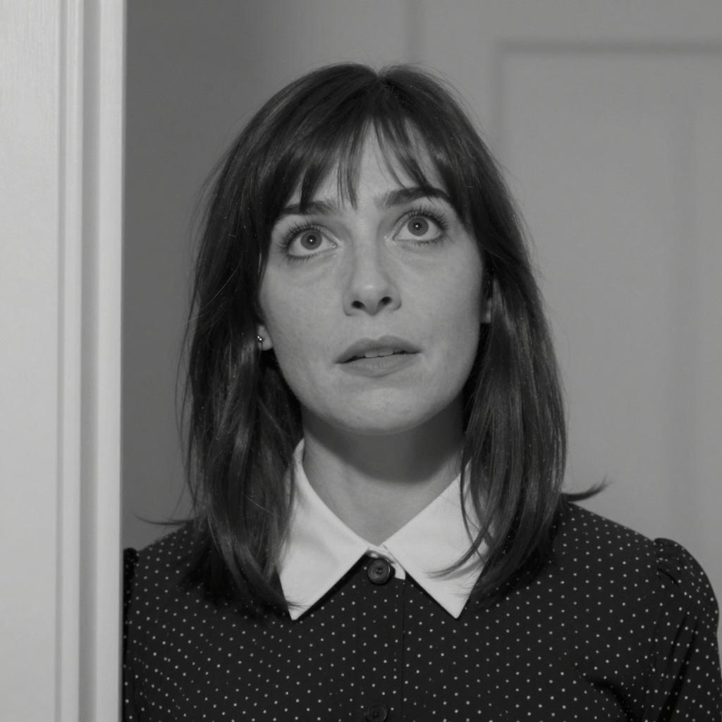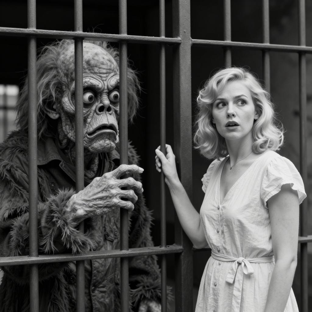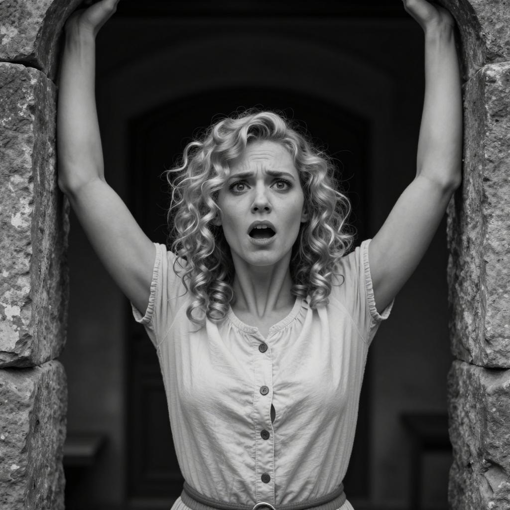 Black and white photograph of a woman in a flowing, sleeveless dress standing next to a human skeleton. The woman has wavy, shoulder-length hair, a startled expression, and her hands are clasped in front of her chest. The skeleton is positioned to her right, with its skeletal arms resting on her shoulders. The background includes a dark wooden door. The skeleton's shadow is cast on the wall behind it. The woman's shadow is also visible on the left.