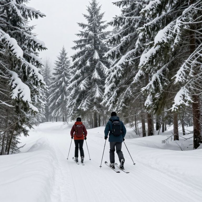 Amidst the serene embrace of snow-draped pines, two skiers traverse a quiet trail, their journey embodying the harmonious dance between solitude and companionship, while the crisp air whispers tales of winter's enduring beauty.
