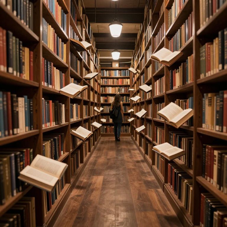 Photograph of a dimly-lit library aisle with wooden shelves filled with colorful books, white open books floating in mid-air, and a blurred person