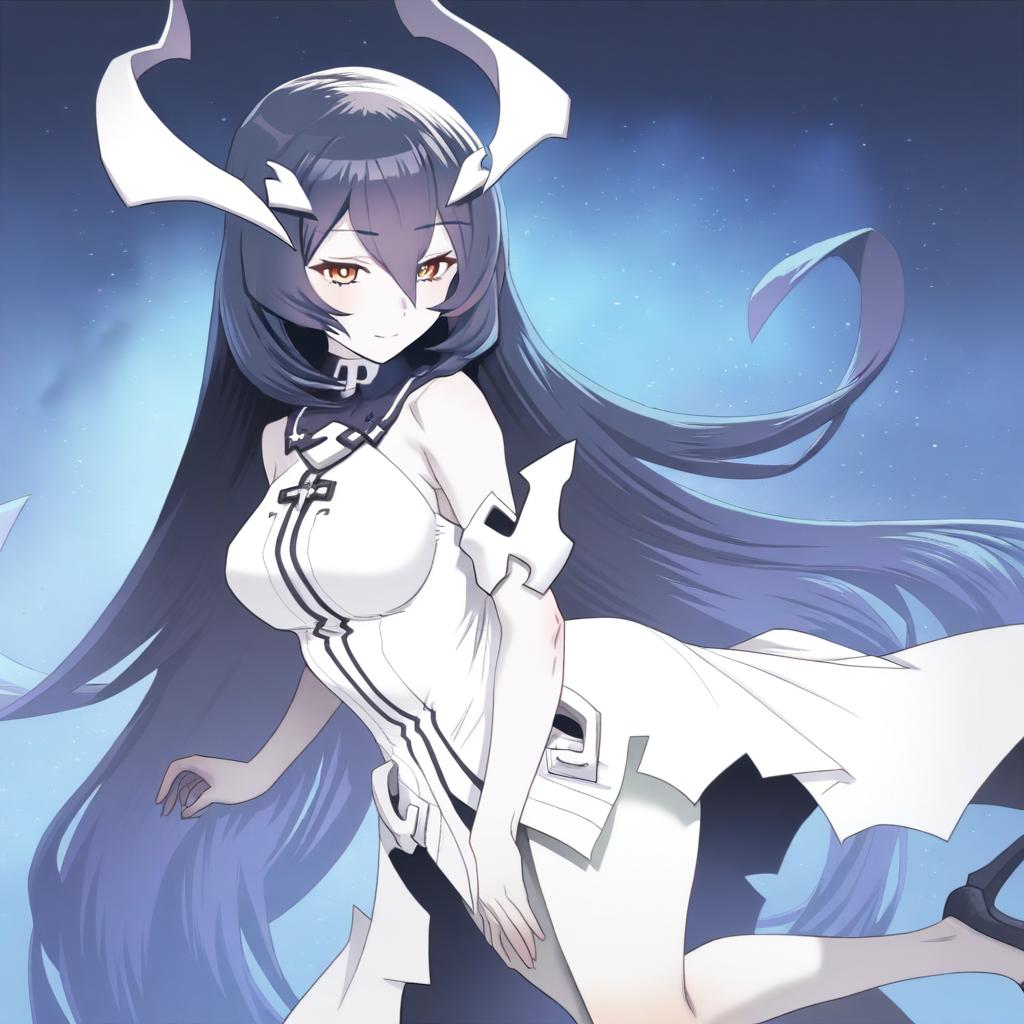 Anchorage water oni, kantai collection, 1girl, white skin, pale skin, horns, red eyes, black hair, very long hair, long hair, gradient hair, white dress, by artist meow (nekodenki), animagine