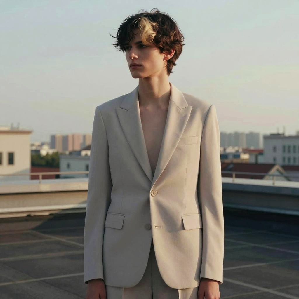 Two-Tone Hair hairstyle on fashion model, wearing minimalist chic suit, in rooftop, captured in fashion editorial style with cinematic tone.