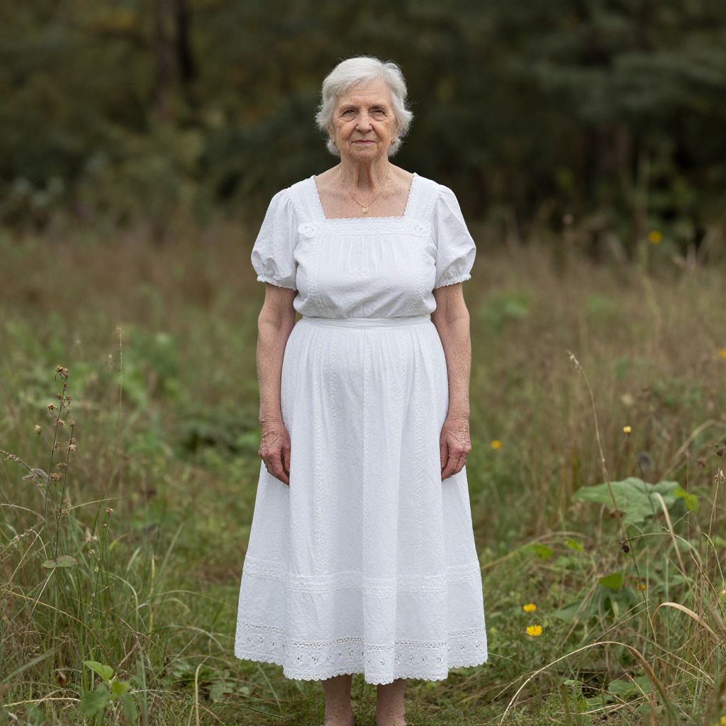 Photograph of an elderly woman with short, white hair standing in a grassy meadow. She wears a simple, white, short-sleeved, knee-length dress with delicate lace trim along the hem and neckline. Her skin is fair and wrinkled, and she has a gentle, slightly smiling expression. The background is blurred, featuring tall green grass and yellow wildflowers, with dark green trees in the distance. The lighting is natural, highlighting her dress and the textures of the meadow. The overall mood of the image is serene and peaceful.