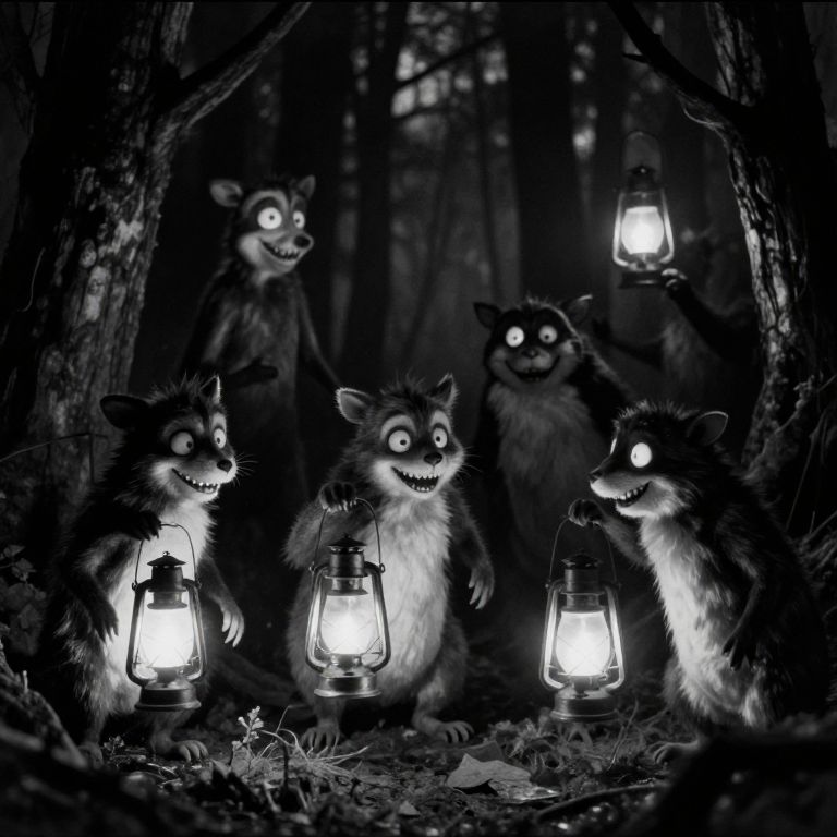 A digital illustration in black and white depicts five furry, raccoon-like creatures with large, glowing eyes and sharp teeth, standing in a dark forest. Each creature holds a lit lantern, casting a bright glow. The background shows blurred tree trunks and foliage, creating a spooky, eerie atmosphere. The creatures' expressions are a mix of curiosity and mischief, with one in the background appearing to smile. The lanterns are positioned at various angles, illuminating their faces and fur. The texture of their fur is detailed, adding a sense of realism to the fantastical scene.