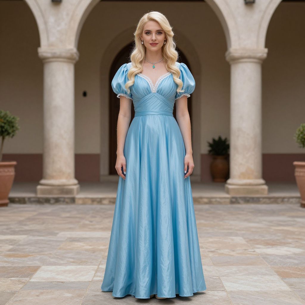 Photograph of a blonde woman in a flowing, light blue, V-neck ball gown with puffed sleeves, standing in a stone courtyard with arched