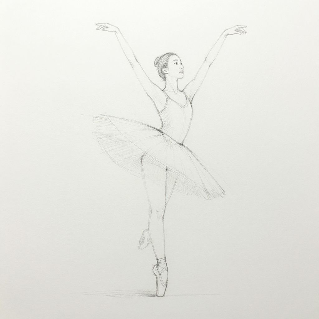 Black-and-white sketch of a ballerina in a tutu, standing en pointe with arms raised, delicate lines, minimal detail, white background