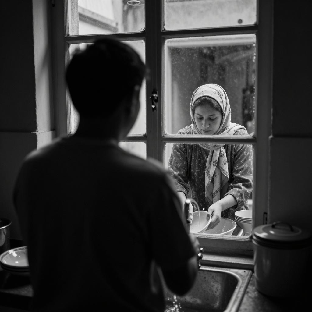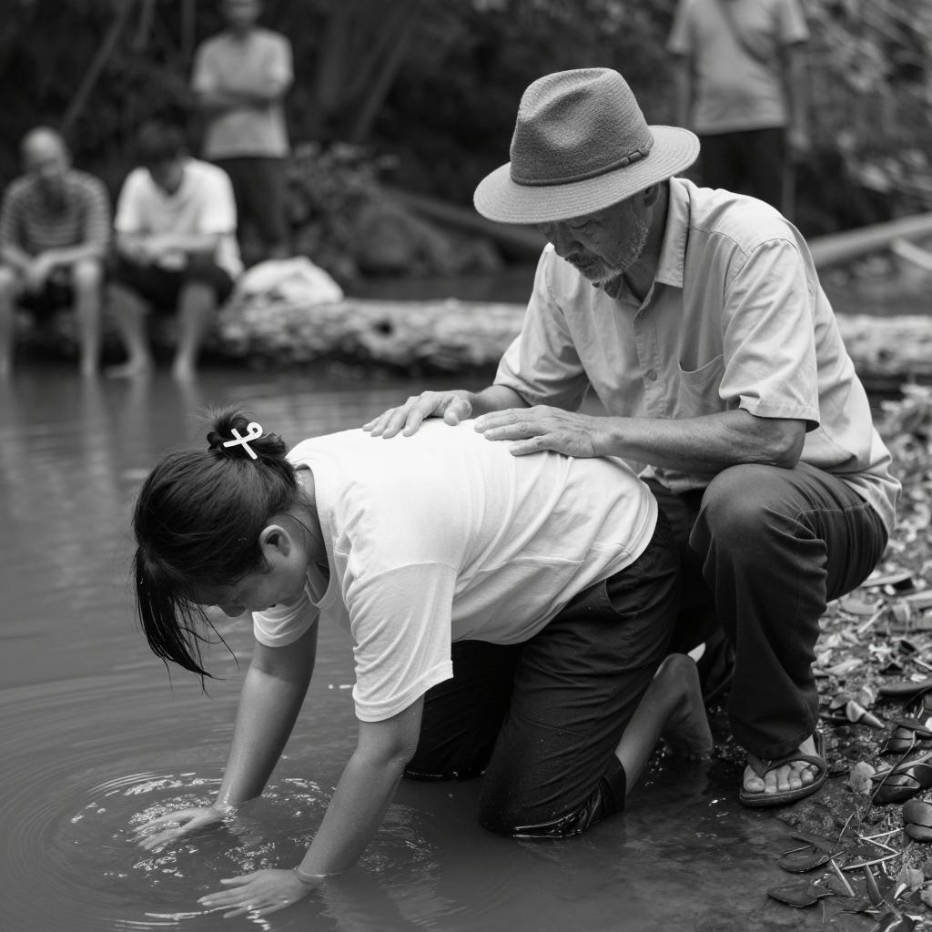 Black and white photograph. Man with hat, light shirt, and dark pants kneels behind woman in light shirt and dark pants. Woman bends forward, hands in shallow water, hair tied with cross-shaped clip. Background: forest, people sitting on logs. Man's hands rest on woman's back. Water ripples around them.