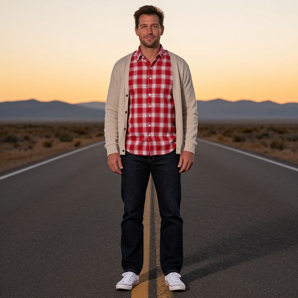 Photograph of a smiling man with short brown hair, wearing a light gray sweater, blue shirt, dark jeans, and tan boots, standing on a