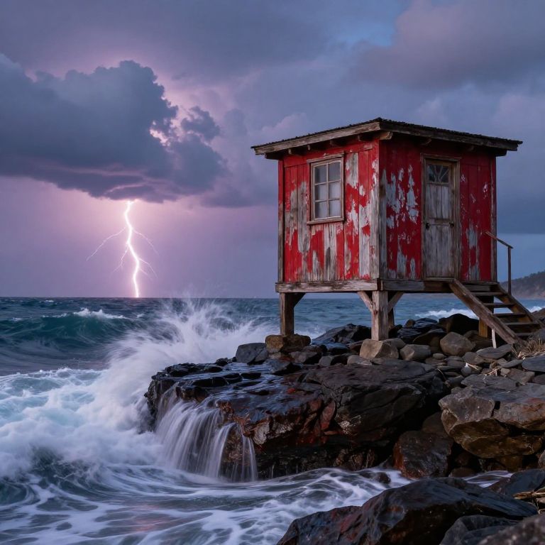 Torri perched on a rocky coastline under a dramatic twilight sky, waves crashing against the stones below, lightning illuminating distant clouds, the structure detailed with weathered wood and red paint fading, powerful and dynamic natural setting.