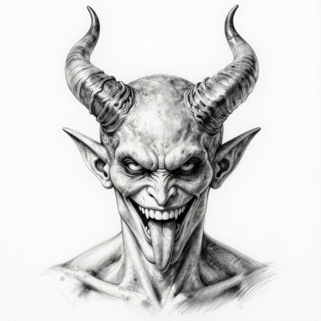 This is a black-and-white, detailed pencil drawing of a demonic-looking character with large, curved horns, pointed ears, and a long, forked tongue sticking out. The character has a grinning, sinister expression with deep-set eyes and a wrinkled forehead. The background is plain and off-white, with no depth of field as the focus is entirely on the character. The lighting is even, highlighting the texture and shading of the drawing. The camera angle is straight-on, capturing a close-up of the character's head and upper shoulders.