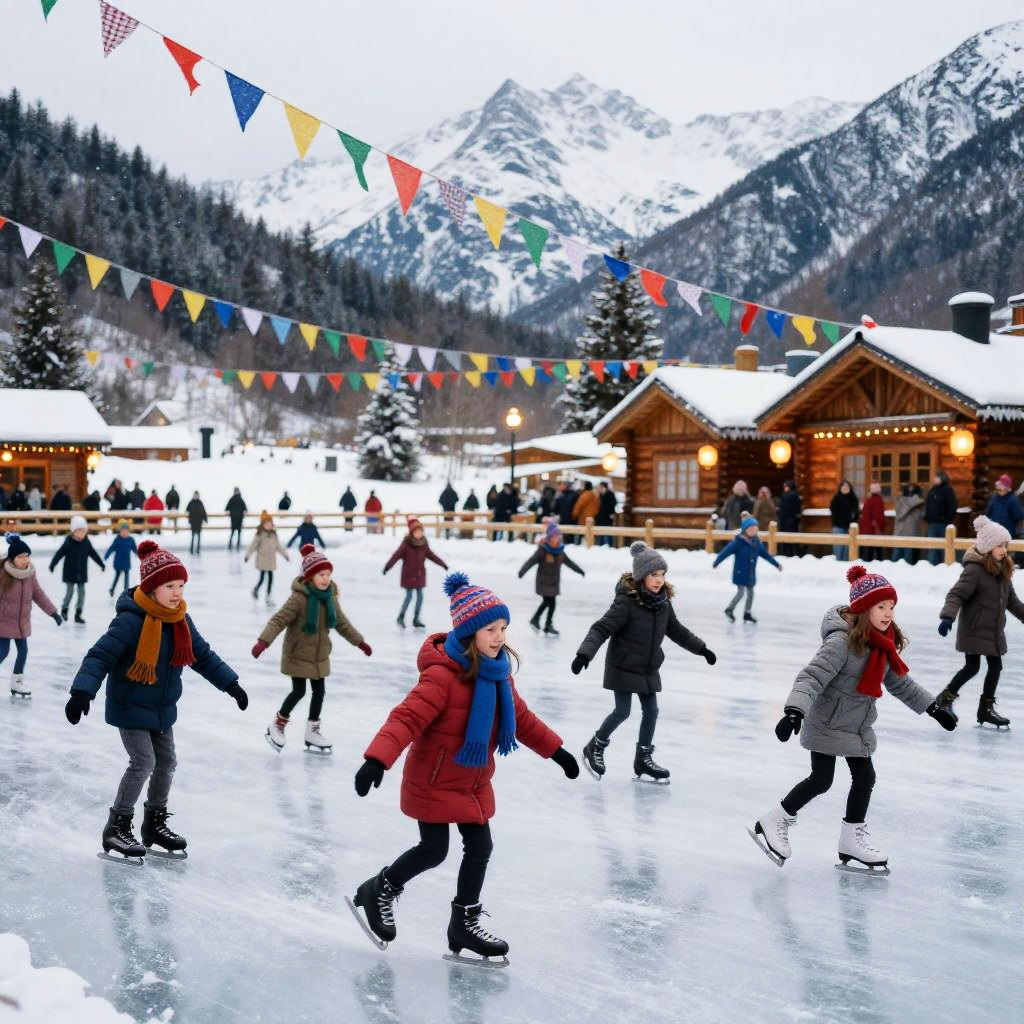 Frohe winter festival with children ice skating on a frozen pond, colorful scarves and hats, snow-capped mountains in the background, festive banners fluttering in the breeze, traditional wooden chalets, glowing lanterns on the shore, dynamic composition with lively energy.