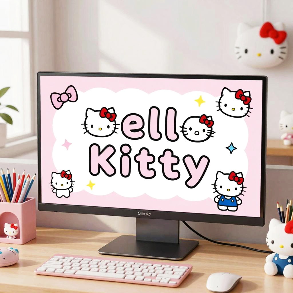 Hello Kitty font generator, cozy pink and white desktop setup, featuring a touch screen displaying whimsical font styles with cat face motifs, colorful and cheerful UI, surrounded by Hello Kitty plushies and cute stationery, soft morning light, illustration style