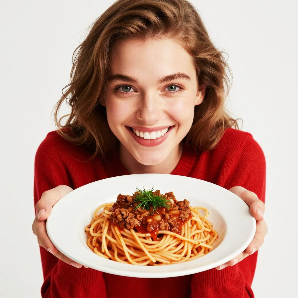Photograph of two smiling women, one a brunette in an orange sweater, the other a brunette in a white chef's uniform and hat, sitting at a table. The chef points at a plate of spaghetti with meat sauce, which the woman in the orange sweater is eating with a fork, her mouth open and spaghetti dangling. The background is completely white, emphasizing the subjects. Both women have wavy hair and are looking at each other, exuding joy and enthusiasm. The plate is white, and the fork is silver.