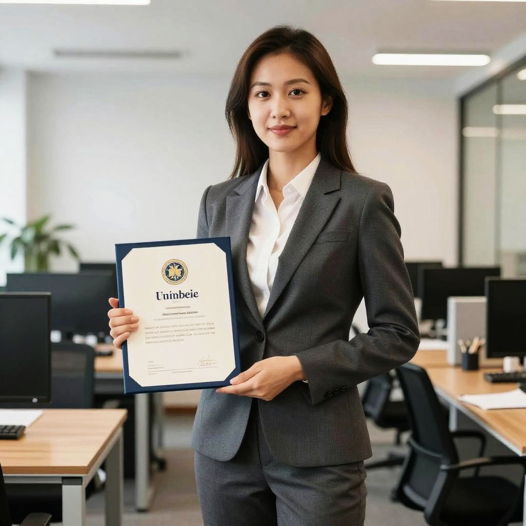 Certified professional standing confidently in a modern office environment, wearing a sleek suit and holding a certificate, warm natural lighting, high detail, realistic style, emphasizing achievement and accomplishment.