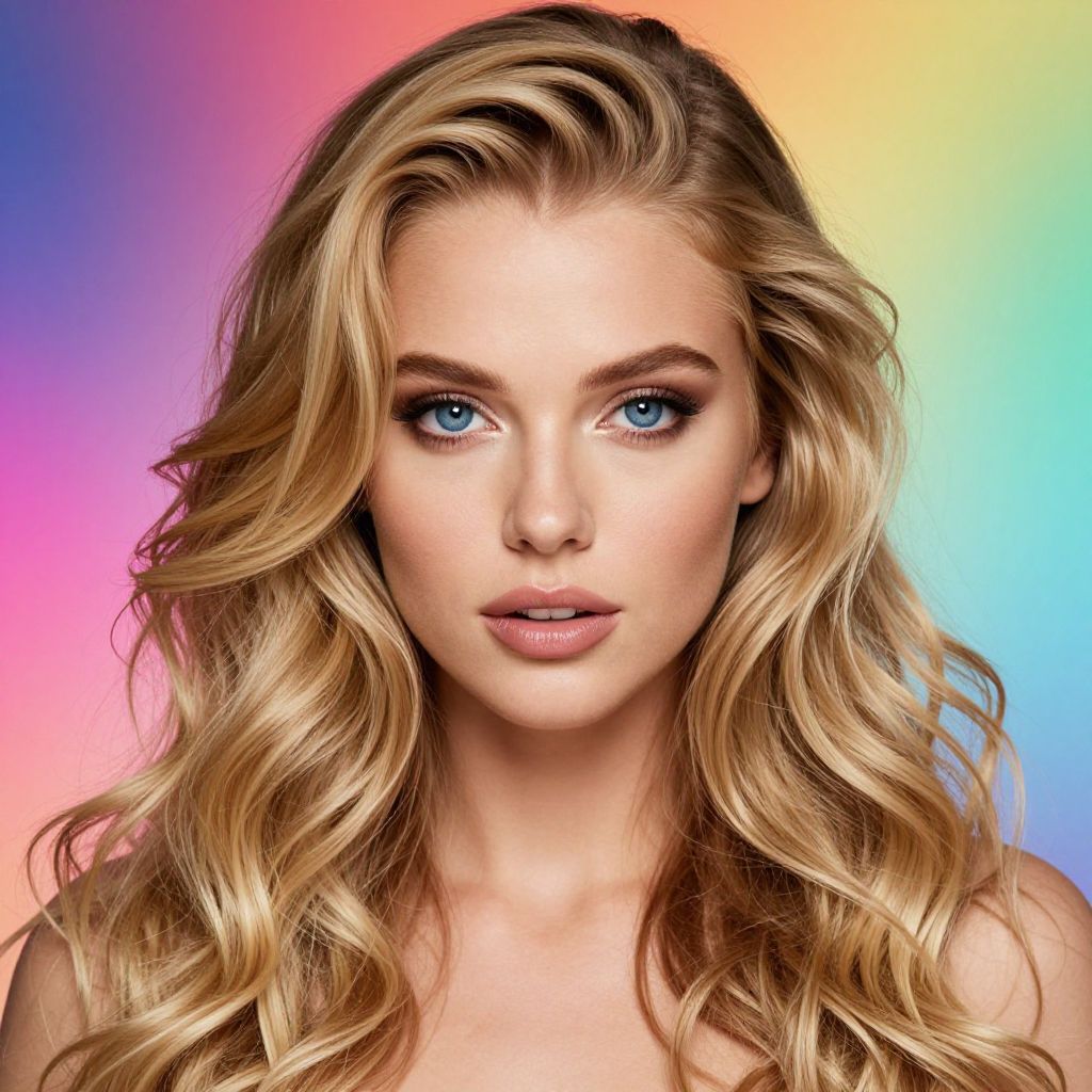A beautiful, photorealistic woman with long, wavy blonde hair and striking blue eyes, set against a vibrant, colorful background with a glowing effect.