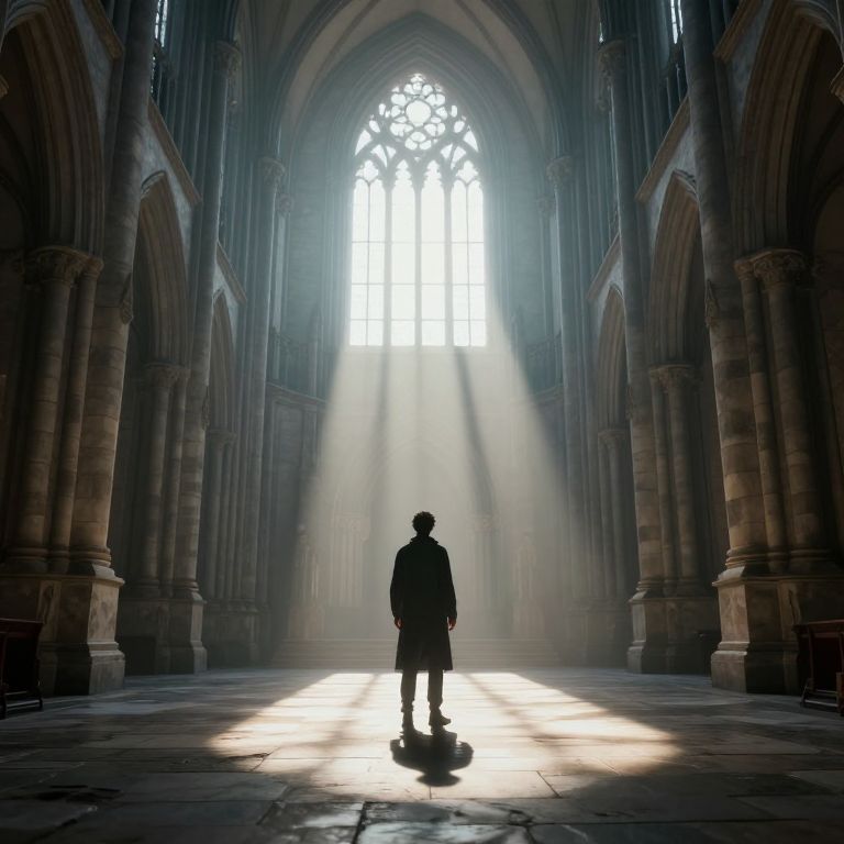 A solitary figure stands in the ethereal glow of a grand, gothic cathedral, where dramatic lighting casts long shadows across the stone floor, evoking a sense of mystery and introspection in this atmospheric 3D-rendered scene.