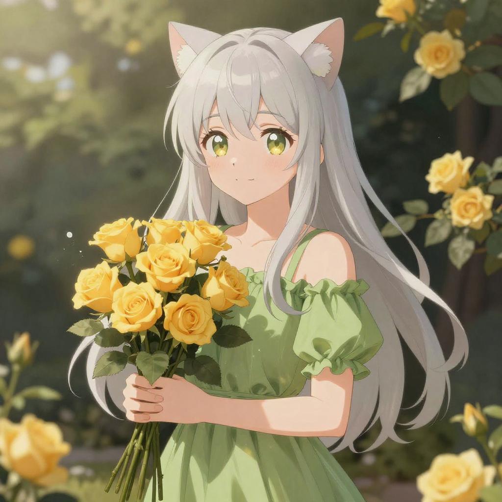 Digital illustration of an anime-style girl with fox ears and tail wearing a white dress, standing in a sunlit forest surrounded by foliage.