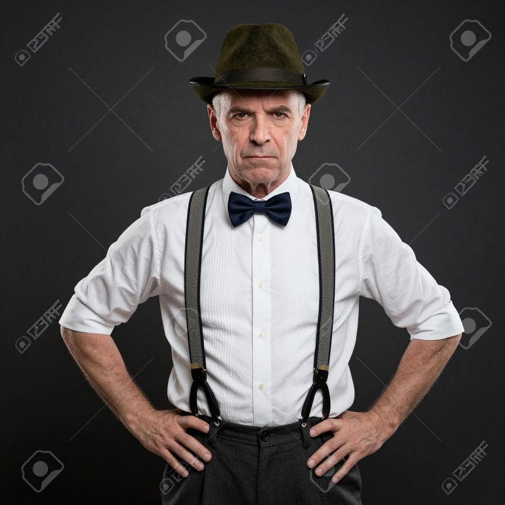 Pink outfit man costume, solo, 1boy, male focus, hat, hands in pockets, outdoors, old, old man, looking at viewer, tree, blurry, pink headwear, blurry background, day, cowboy shot, glasses, pink pants