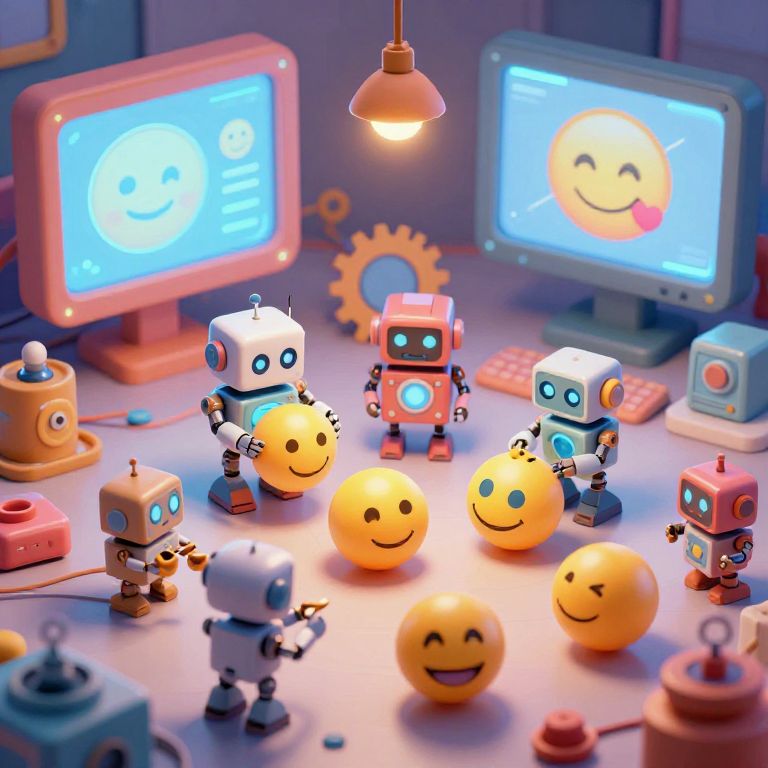 Photograph of a colorful, whimsical robotic scene featuring six small, cartoonish robots and five yellow emoji-shaped figures with smiling faces. The robots are metallic with glowing blue eyes and various bright colors, standing around a white desk. Two large, illuminated monitors with blue screens displaying emojis are in the background, flanked by a hanging light bulb. Additional robotic accessories, including gears and a pink box, are scattered around. The overall style is playful and futuristic, with a soft, blue-tinged lighting enhancing the cheerful atmosphere.