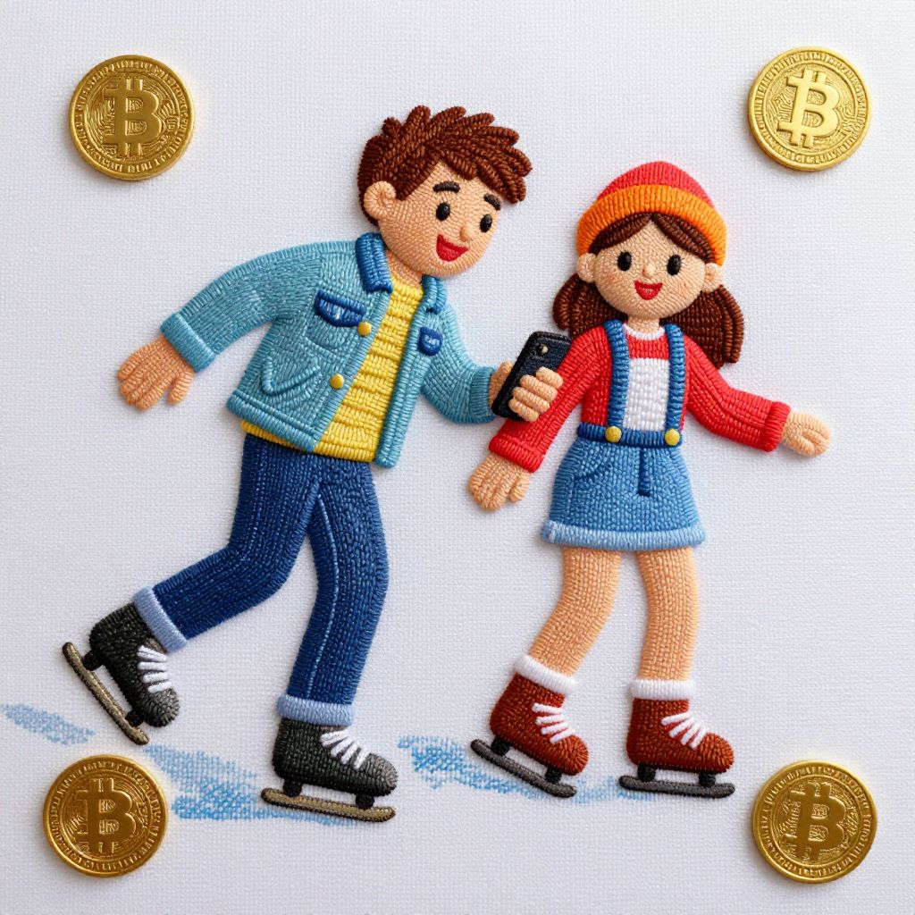 Colorful embroidered illustration of a smiling boy and girl ice skating, wearing winter clothes, holding hands, surrounded by gold coins.