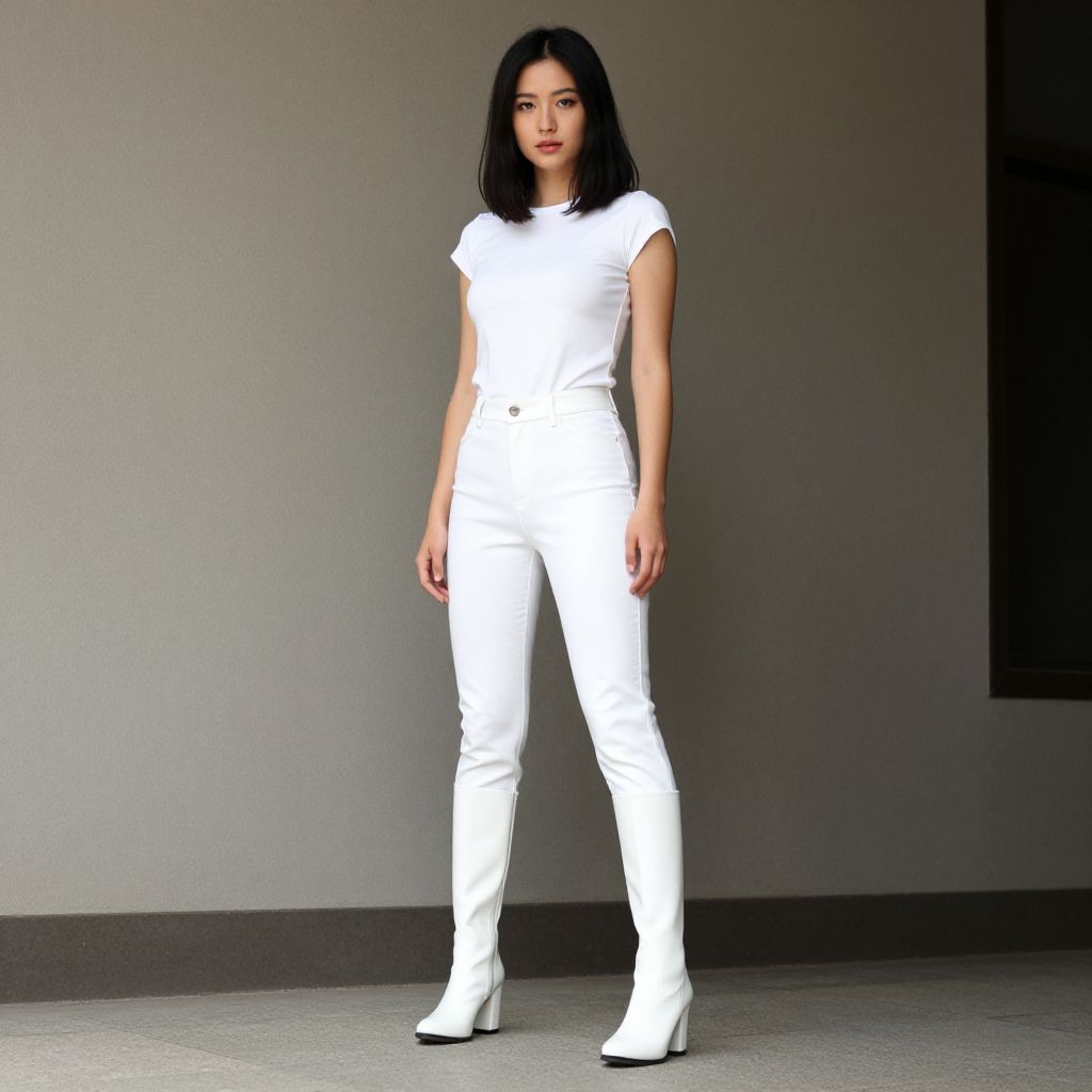 "white gogo costume boots, solo, 1girl, boots, full body, standing, white pants, looking at viewer, pants, realistic, black hair, white footwear Realistic photo of casual sexy person with pretty face"