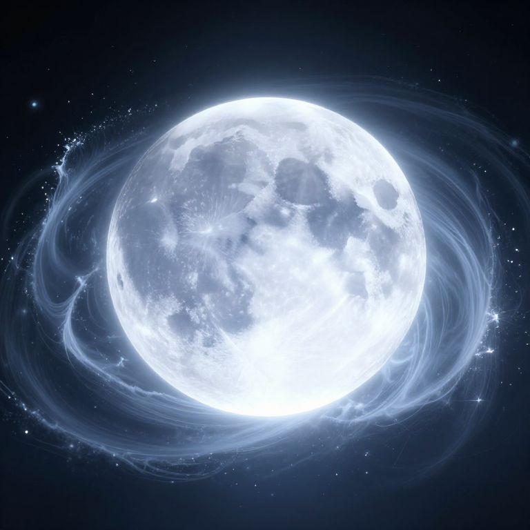 Digital artwork of a luminous, glowing full moon surrounded by swirling, ethereal white clouds against a dark, star-speckled night sky.