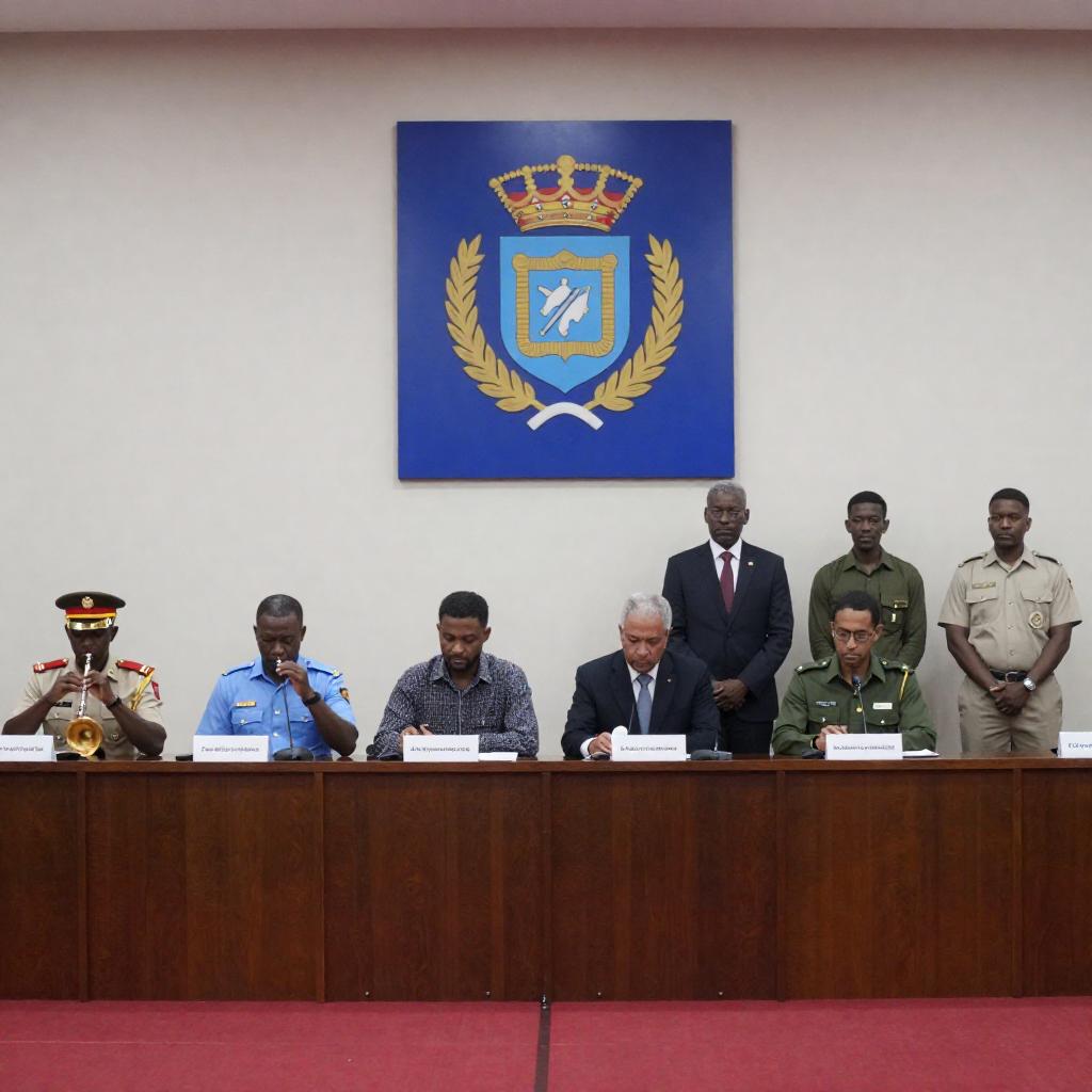 Photograph of a conference panel. Six people sit at a table. Three men in uniform with hats on the left play instruments. Five panelists, one in blue shirt, one in patterned shirt, two in suits, one in green shirt, one in beige uniform, stand behind microphones. Blue banner with coat of arms on the wall behind them. Red carpet, wooden paneling.